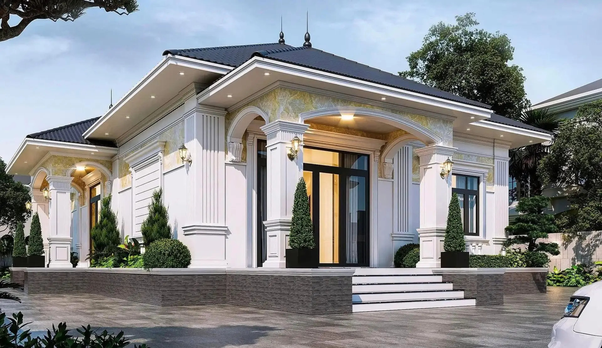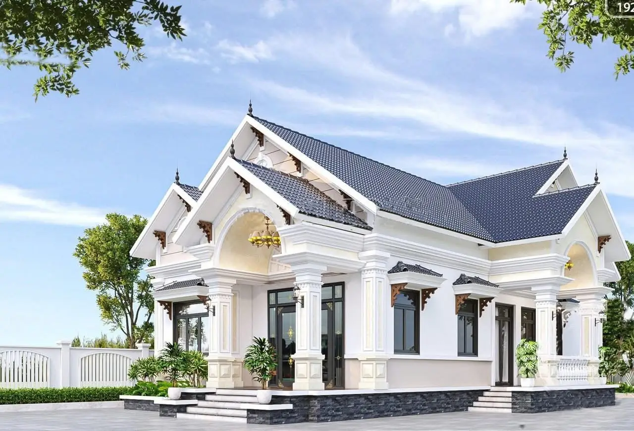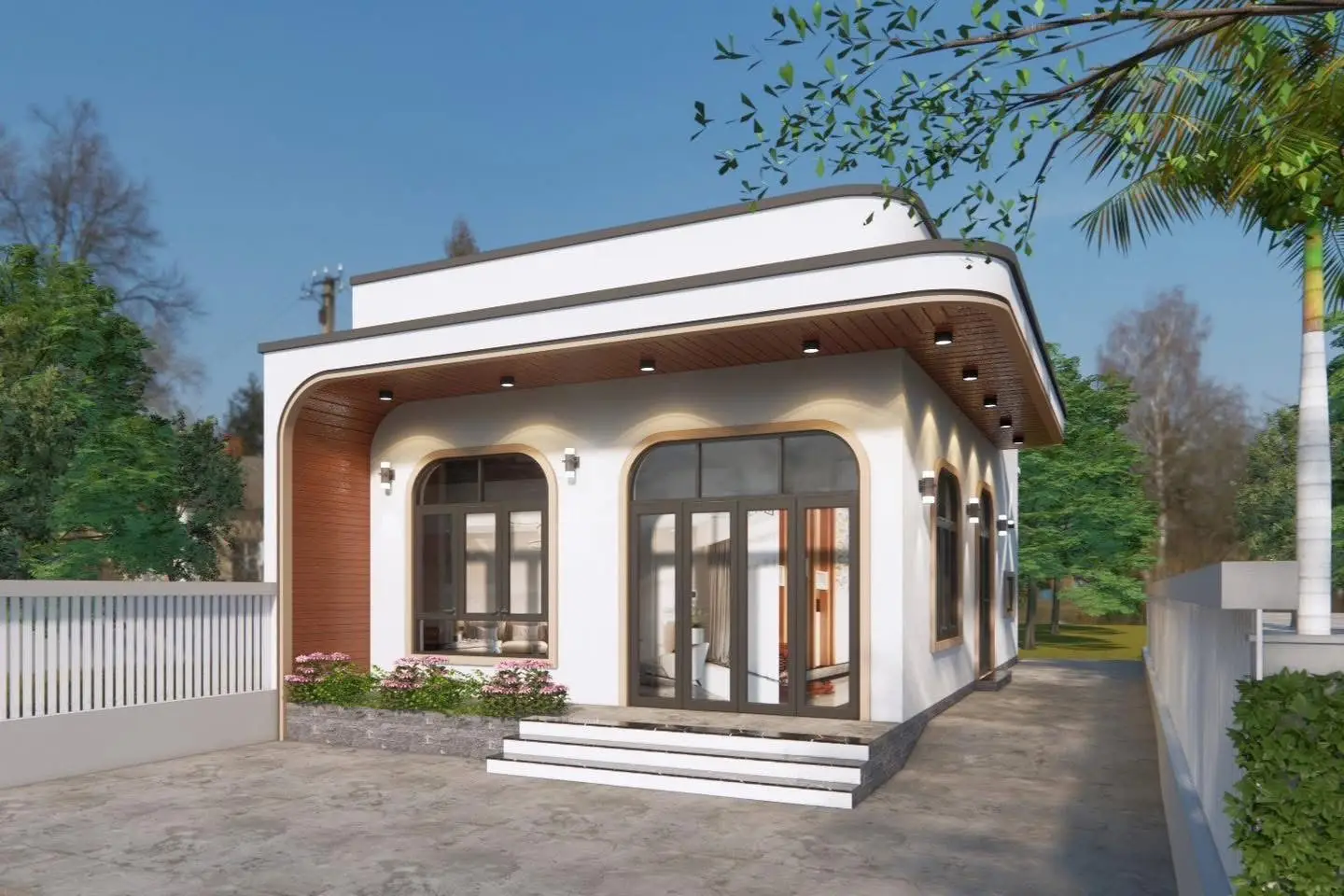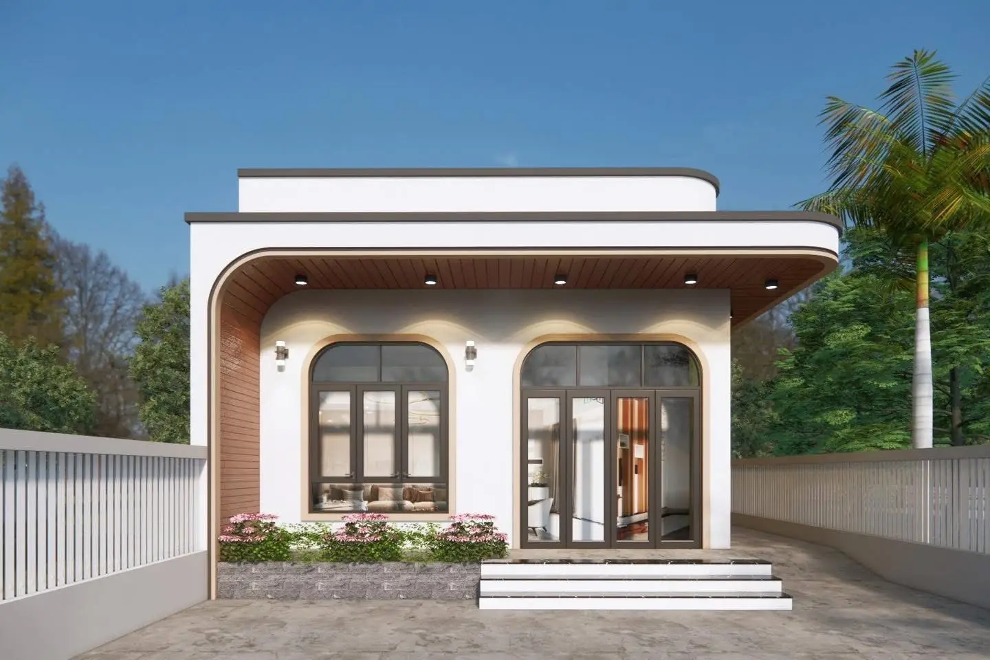 Mang đậm hơi thở hiện đại và sang trọng, mẫu nhà cấp 4 kiểu hiện đại sử dụng cửa kính lớn, tường trắng và mái dốc nhẹ, thích hợp ở vùng ven thành phố, kiểu thiết kế này phù hợp với các gia đình trẻ ra ở riêng, với chi phí đầu tư tiết kiệm.