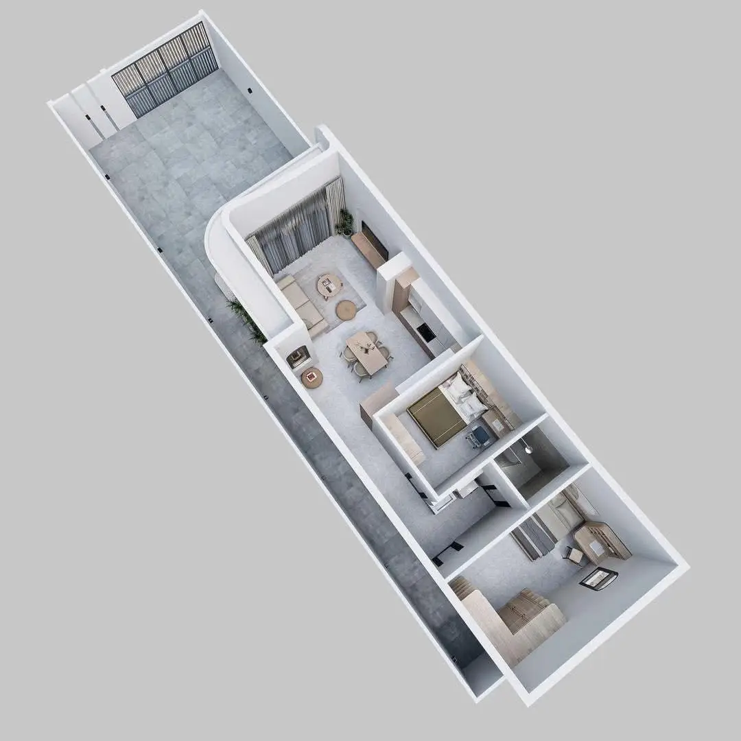Phù hợp cho người độc thân hoặc vợ chồng mới cưới. Thiết kế đơn giản gồm: 1 phòng ngủ, 1 phòng khách, 1 bếp nhỏ và toilet.